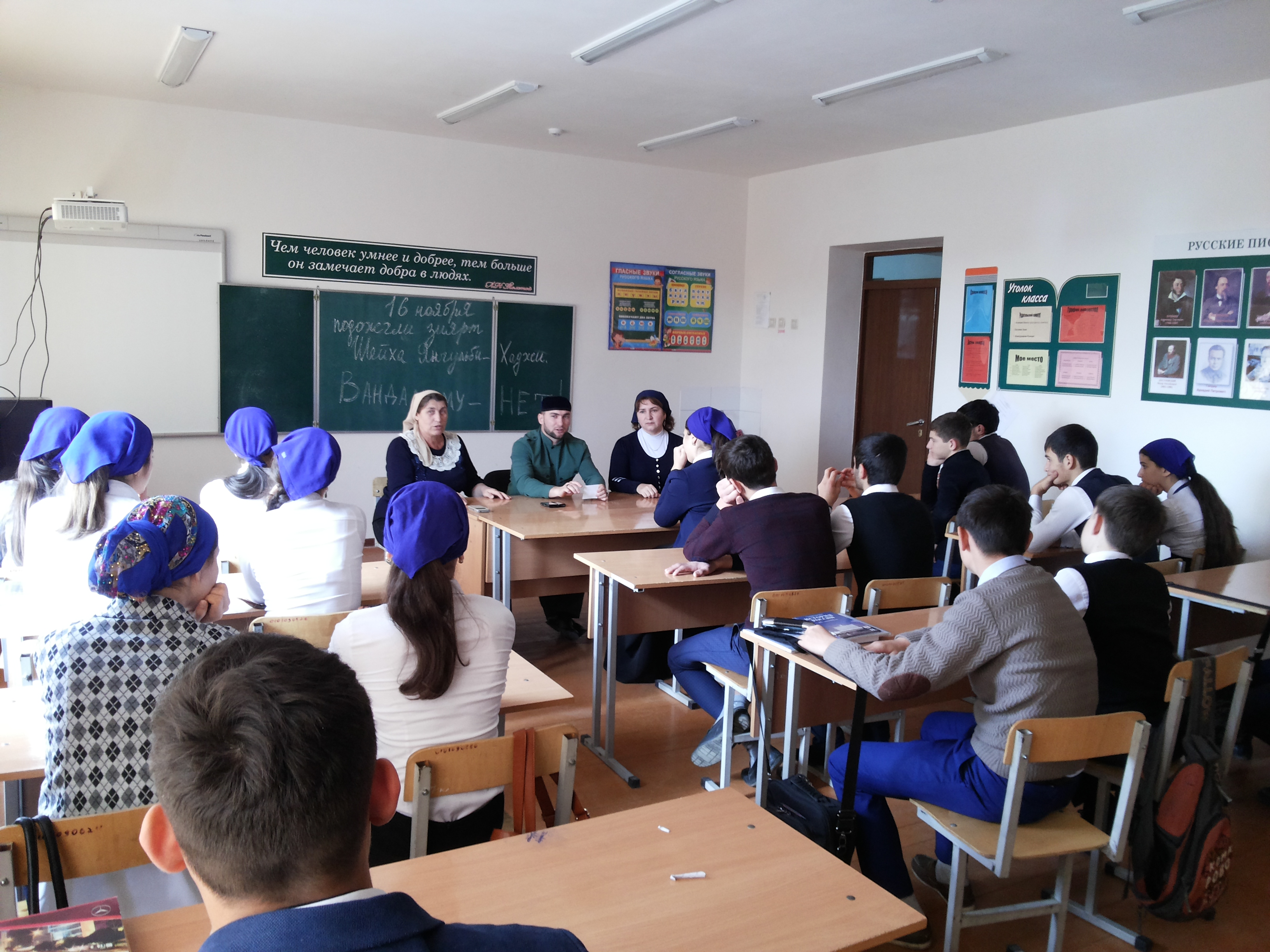 С целью разъяснения учащимся Ихсана, суфизма, основ тариката и исполнения вирда, а также ознакомления святых мест – зияртов, в МБОУ «СОШ с.п.Комарова» 19 ноября 2015 г. педагог-организатор по духовно-навственному воспитанию Абдулаев Х.Х. провел беседу с обучающимися 8-11классов.Он рассказал о жизни и учении святых авлия, шейхов, устазов и святых мест зияртов. Рассказал о том, что наши предки почитали и поклонялись им.Абдулаев Х. рассказал детям о совершенном акте вандализме – поджоге зиярта шейха Янгульби-Хаджи в селе Курчалой Курчалоевского района.Абдулаев сделал акцент на то, что нынешняя молодежь больше слушается интернет-проповедников, и их слова берут на веру. Пусть молодежь следует советам старейшин в своего села, своего народа, они вредного, неправильного ничего не посоветуют.