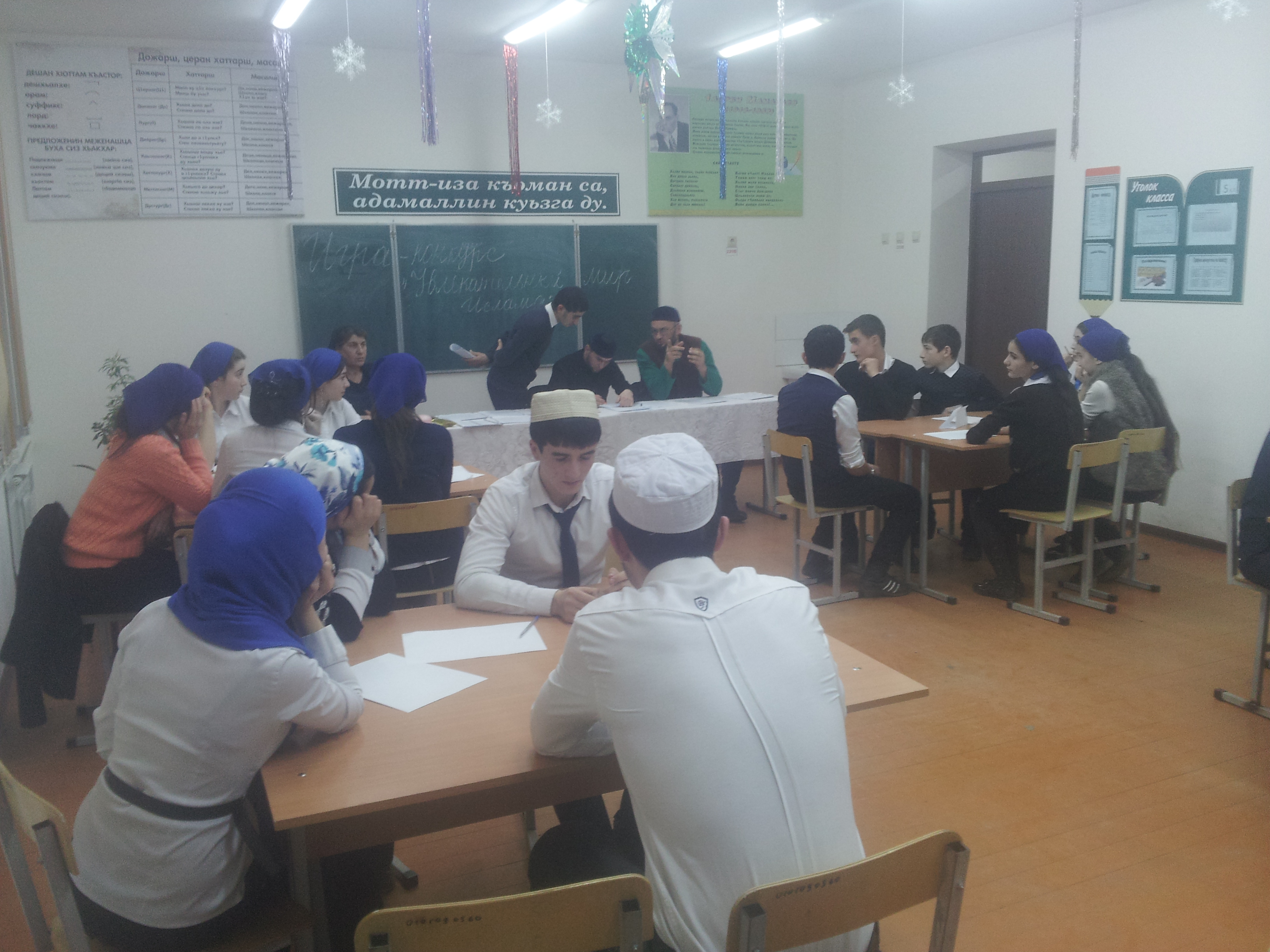 В рамках реализации ЕК по ДНРиВ подрастающего поколения и с целью ознакомления праведной жизнью и проповеднической деятельностью Пророка Мухаммада (да благословит его Аллах и приветствует) и авлия – устаза Кунта – хаджи Кишиева в МБОУ «СОШ с.п. Комарова Надтеречного муниципального района ЧР» 22-23.12.2014 года проведено оформление прилегающей территории и здания школы баннерами, плакатами. На специальном стенде «Духовно – нравственное воспитание и развитие» размещена информация о благословенном и досточтимом месяце Рабийуль – авваль, а также приведены примеры нравственных качеств нашего любимого Посланника Аллаха (да благословит его Аллах и приветствует). С целью повышения духовно – нравственных качеств, поддержания Имана и обогащения детей знаниями о своей религии, ЕДЮО Чеченской Республики им. Ахмат – Хаджи Кадырова, был создан проект «Увлекательный мир Ислама», с помощью которого дети смогут в игровой форме развивать в себе духовные качества. Дух соперничества всегда заставляет учиться усерднее, а игровая форма сможет вызвать у детей больше интереса. Конкурс состоял из пяти этапов. В ней участвовали команды 8 – 11 классов. Активное участие в проведении школьного этапа конкурса – игры «Увлекательный мир Ислама» принял лидер ЕДЮО нашей школы, учащийся 10 класса Гицаев И.А. По итогам всех пяти этапов 1 место заняла команда «Нур» (9 кл.). Также среди учащихся 1- 11 классов показан видеоматериал «Последняя проповедь Пророка Мухам-мада (с.1.в. с) и проведены беседы на тему: «Мухаммад (мир ему и благословение Аллаха) - самое лучшее и прекрасное создание из творений Всевышнего Аллаха». Среди учащихся 5 – 11 классов показан видеоматериал «Кавказская история великого шейха – устаза Кунта - хаджи Кишиева», в котором приводятся достоверные сведения из жизни и учения великого праведника и устаза Кунта – хаджи Кишиева из уст Муфтия ЧР Межиева Салаха - хаджи и проведены беседы на тему: «Нравственно – религиозное учение суфия Кунта – хаджи Кишиева». Учащиеся с большим интересом и вниманием смотрели и слушали аяты Священного Корана и хадисы Посланника Аллаха (да благословит его Аллах и приветствует) рассказывающие о лучшем человеке из всех людей созданных Всевышним Аллахом. Немалый интерес они проявили к жизни и учению суфия – проповедника Кунта – хаджи Кишиева. К началу наступления благословенного и досточтимого месяца Раби-йуль – авваль (23.12.2014 г.) была проведена торжественная линейка, посвящённая этому знаменательному событию, во время которой ребята прочитали стихи, прославляющие Посланника Аллаха (да благословит его Аллах и приветствует), исполнили назмы и нашиды, повествующие о его благородном происхождении и пророческой миссии. Активное участие в подготовке и проведении данного мероприятия приняла учитель по предмету «История религий» -Арснукаева Э.Р.Во время торжественной линейки была проведена встреча учащихся с представителями духовенства. Помощник Имама Туркх с.п. Комарова Элишев У.В. рассказал учащимся о пользе чтения салавата Пророку Мухаммаду (да благословит его Аллах и приветствует) и учении шейха и суфия Кунта – хаджи Кишиева. В конце встречи была прочитана молитва (дуа), в котором прославляли Пророка Мухаммада (мир ему и благословение Аллаха) и просили Всевышнего Аллаха о благоденствии, мире и процветании для все