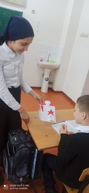 Учитель технологии Даудова Р.М. првела акцию "Поздравь первоклассника с Днем защитника Отечества"! Девочки 6 класса поздравили мальчиков 1 класса!