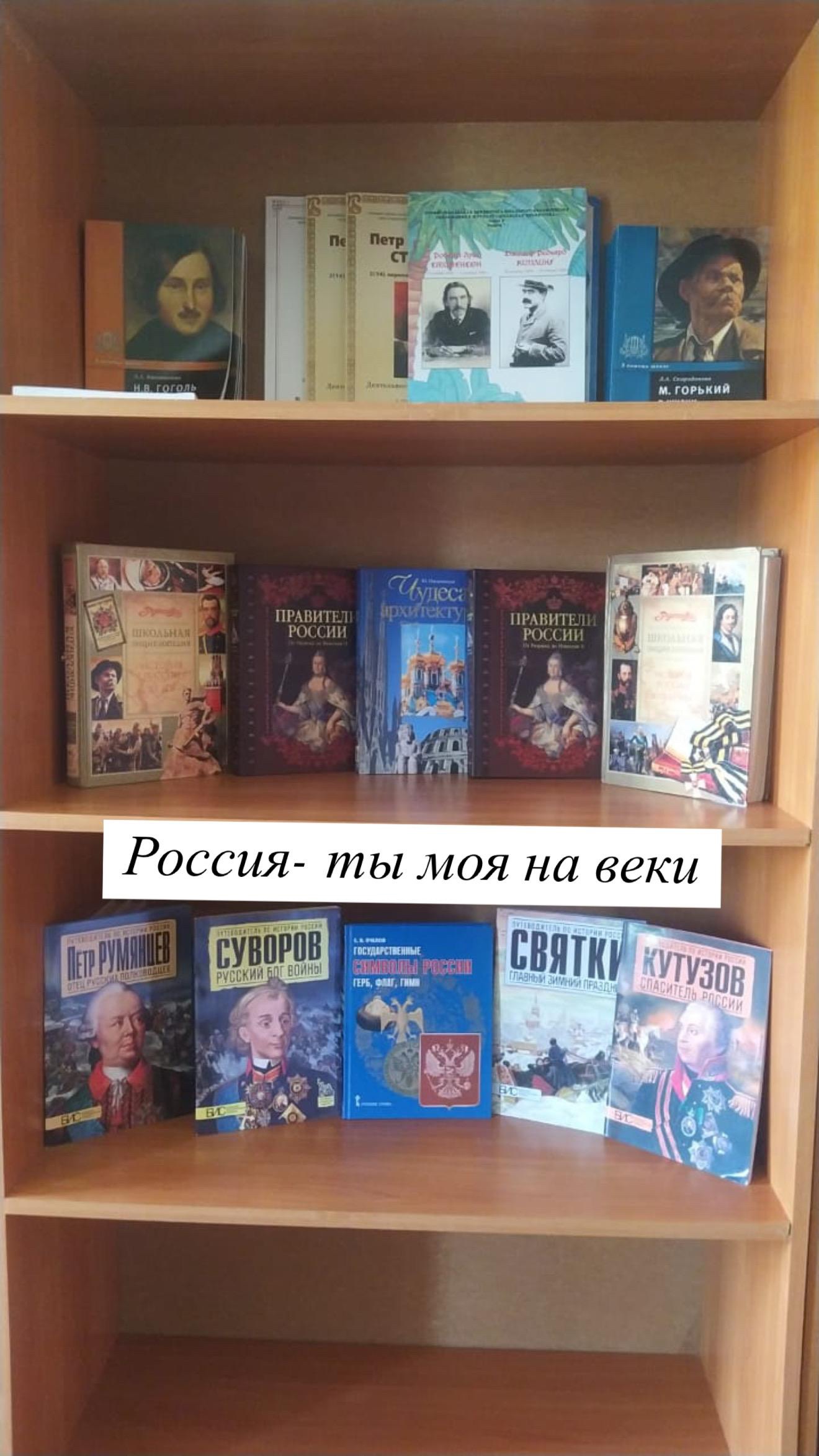 Книжная выставка «Россия-ты моя на веки», посвященная Дню России, представляет собой собрание литературы, посвященной истории, культуре, и природным богатствам страны.